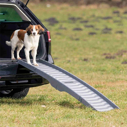 Hat Ihr Hund Probleme beim Ein- oder Aussteigen? Oder wollen Sie die gesunden Gelenke Ihres Vierbeiners nicht zu stark belasten? Die dreifach faltbare Rampe von Trixie ist sehr geeignet, um die Belastung für die Gelenke Ihres Hundes zu minimieren. Benutzen Sie die Rampe präventiv oder wenn Ihr (älterer) Hund an Rücken-/Gelenkproblemen leidet. Die Gangway ist aus Kunststoff und hat TPR-Profile. Dank der Anti-Rutsch-Schicht auf dem Brett würde Ihr Vierbeiner nicht so leicht ausrutschen (auch nicht bei Nässe). Wenn die Gangway vollständig zusammengeklappt ist, erscheint oben ein Griff, so dass sie leicht zu bewegen ist.